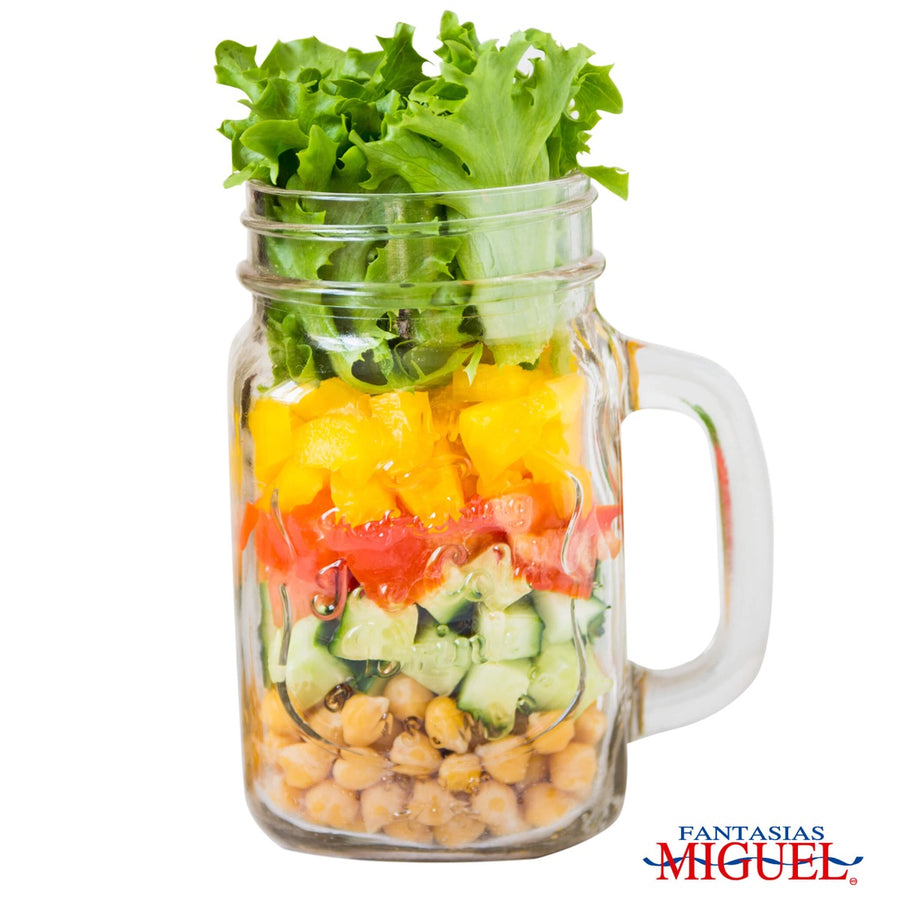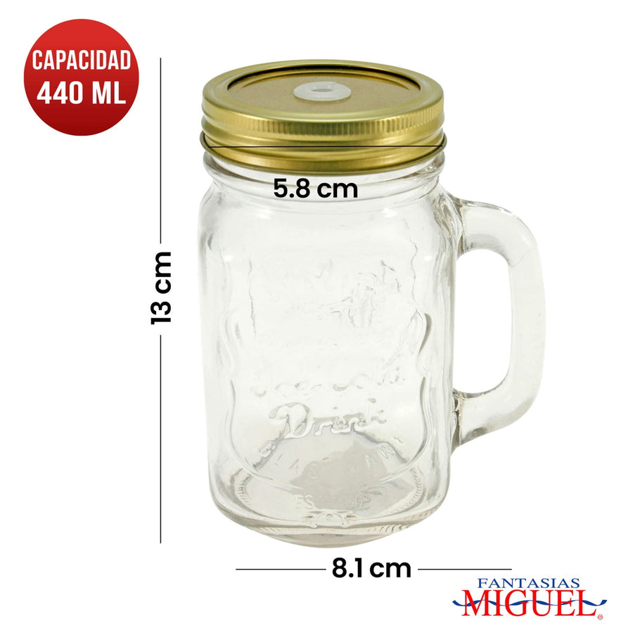 Tarro de cristal con asa,cuenta con tapa métalica, con orificio al centro. Ideal para bebidas, complemento de fiestas tématicas.